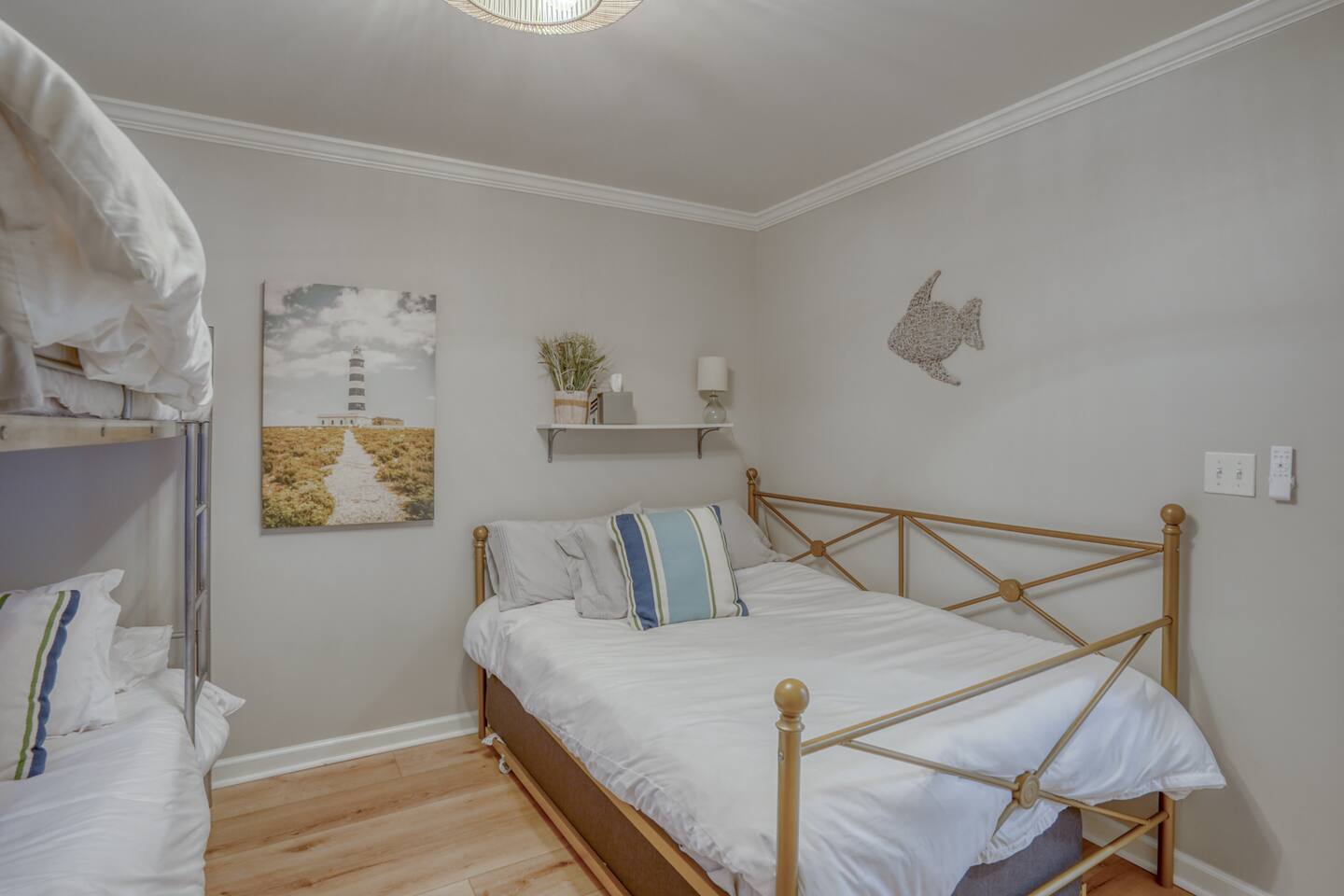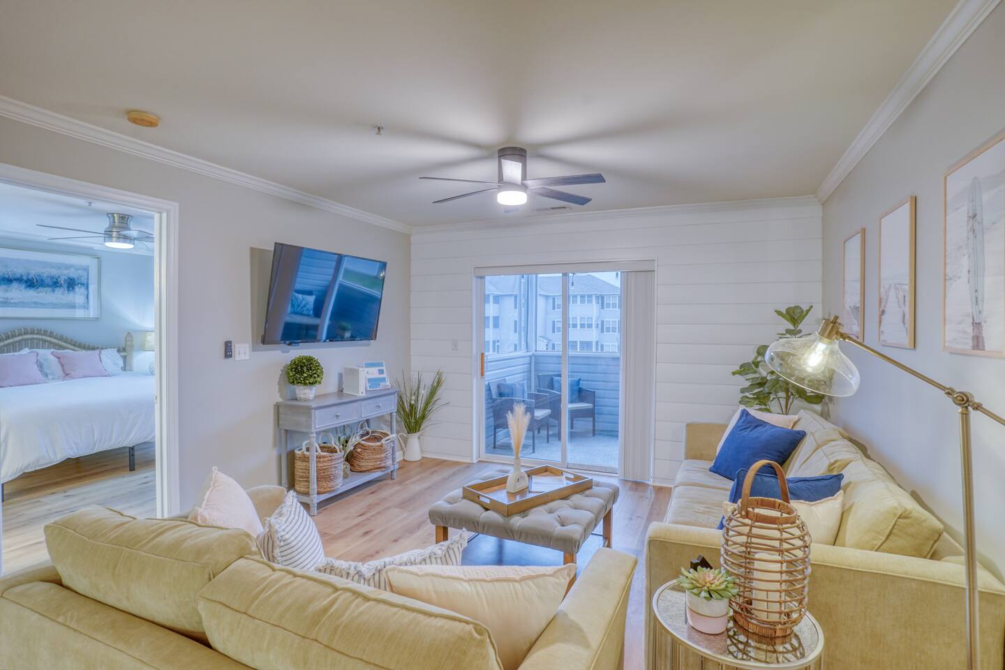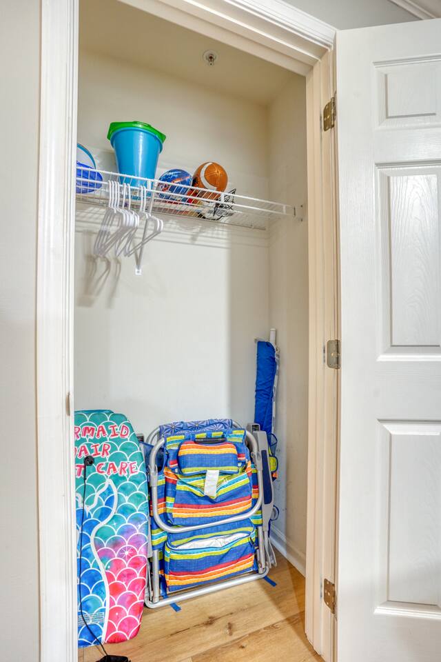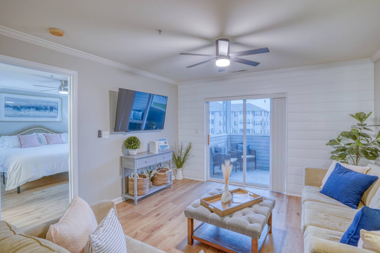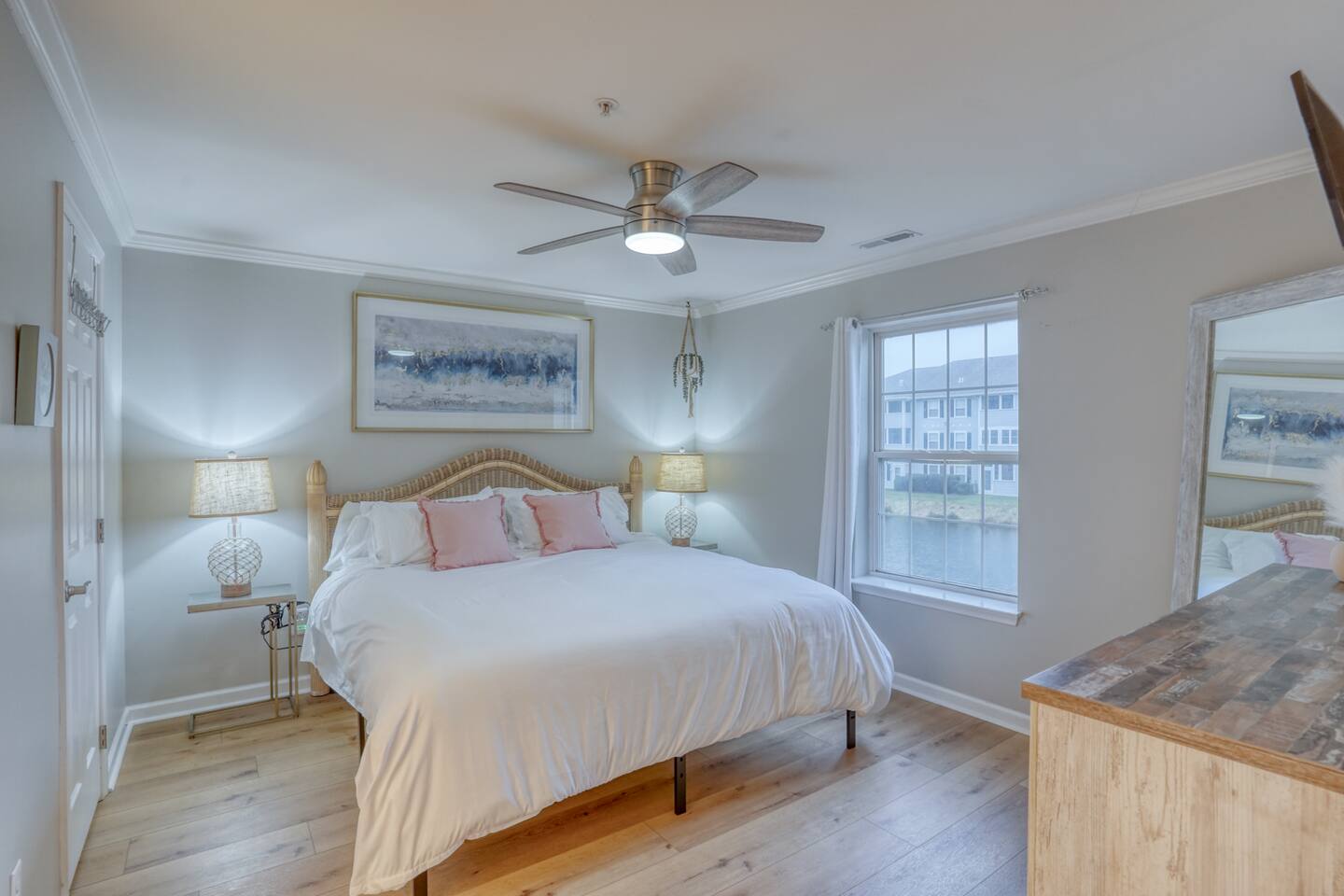 Be aware that the second-floor condo is accessible via stairs. An elevator is available, but it only reaches the third floor, so you will need to walk down one flight of stairs to access the condo. As you enter the front door, you'll find a well-stocked, modern kitchen. To the left is the guest bedroom, which sleeps five guests comfortably with a full-size bed (and single trundle) and a twin bunk bed. Adjacent to the guest bedroom is a full bathroom featuring a bath tub and shower combination. Further into the condo, you'll find the primary bedroom, equipped with a king-size bed, a flat screen smart TV, and an ensuite bathroom with a large vanity and walk-in shower. The living room offers cozy seating and another flat screen smart TV. Just off the living room, step onto the screened-in porch overlooking the community pond and fountain, complete with patio furniture and a hammock swing for your relaxation. Enjoy the peaceful views and unwind in this inviting outdoor space. The condo includes a stackable washer and dryer with complimentary detergent, as well as provided sheets and bath towels for your convenience. Beach chairs, an umbrella, and boogie boards are available for your use as well.