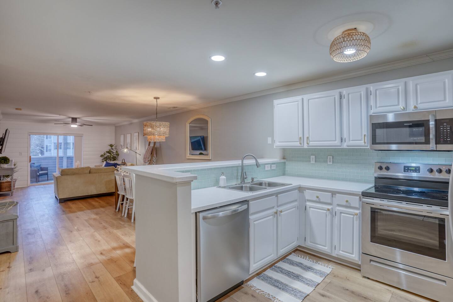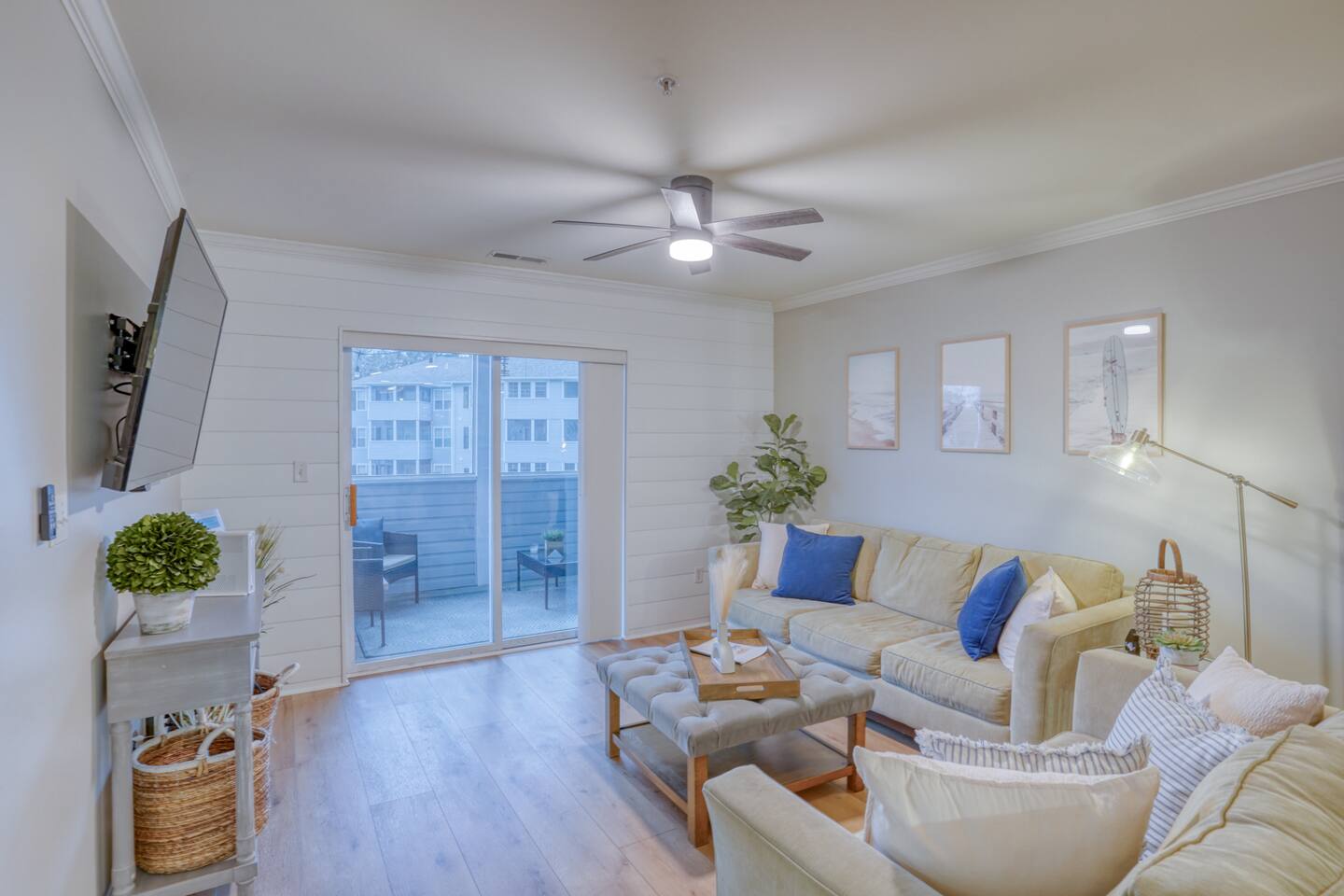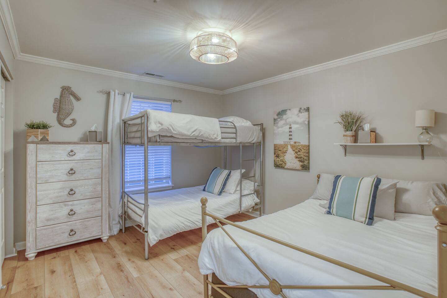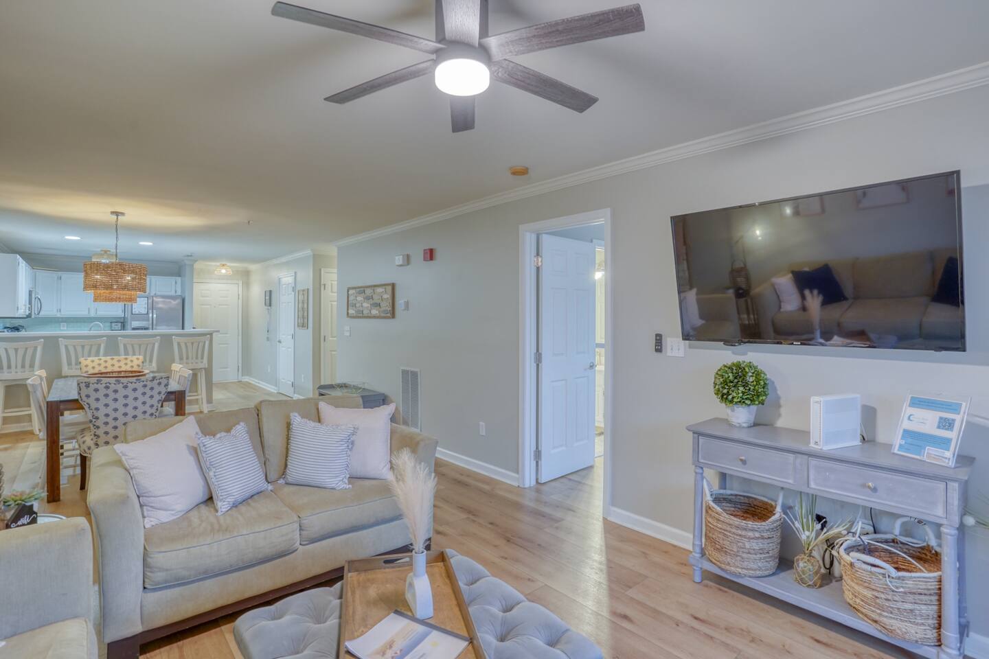 Be aware that the second-floor condo is accessible via stairs. An elevator is available, but it only reaches the third floor, so you will need to walk down one flight of stairs to access the condo. As you enter the front door, you'll find a well-stocked, modern kitchen. To the left is the guest bedroom, which sleeps five guests comfortably with a full-size bed (and single trundle) and a twin bunk bed. Adjacent to the guest bedroom is a full bathroom featuring a bath tub and shower combination. Further into the condo, you'll find the primary bedroom, equipped with a king-size bed, a flat screen smart TV, and an ensuite bathroom with a large vanity and walk-in shower. The living room offers cozy seating and another flat screen smart TV. Just off the living room, step onto the screened-in porch overlooking the community pond and fountain, complete with patio furniture and a hammock swing for your relaxation. Enjoy the peaceful views and unwind in this inviting outdoor space. The condo includes a stackable washer and dryer with complimentary detergent, as well as provided sheets and bath towels for your convenience. Beach chairs, an umbrella, and boogie boards are available for your use as well.