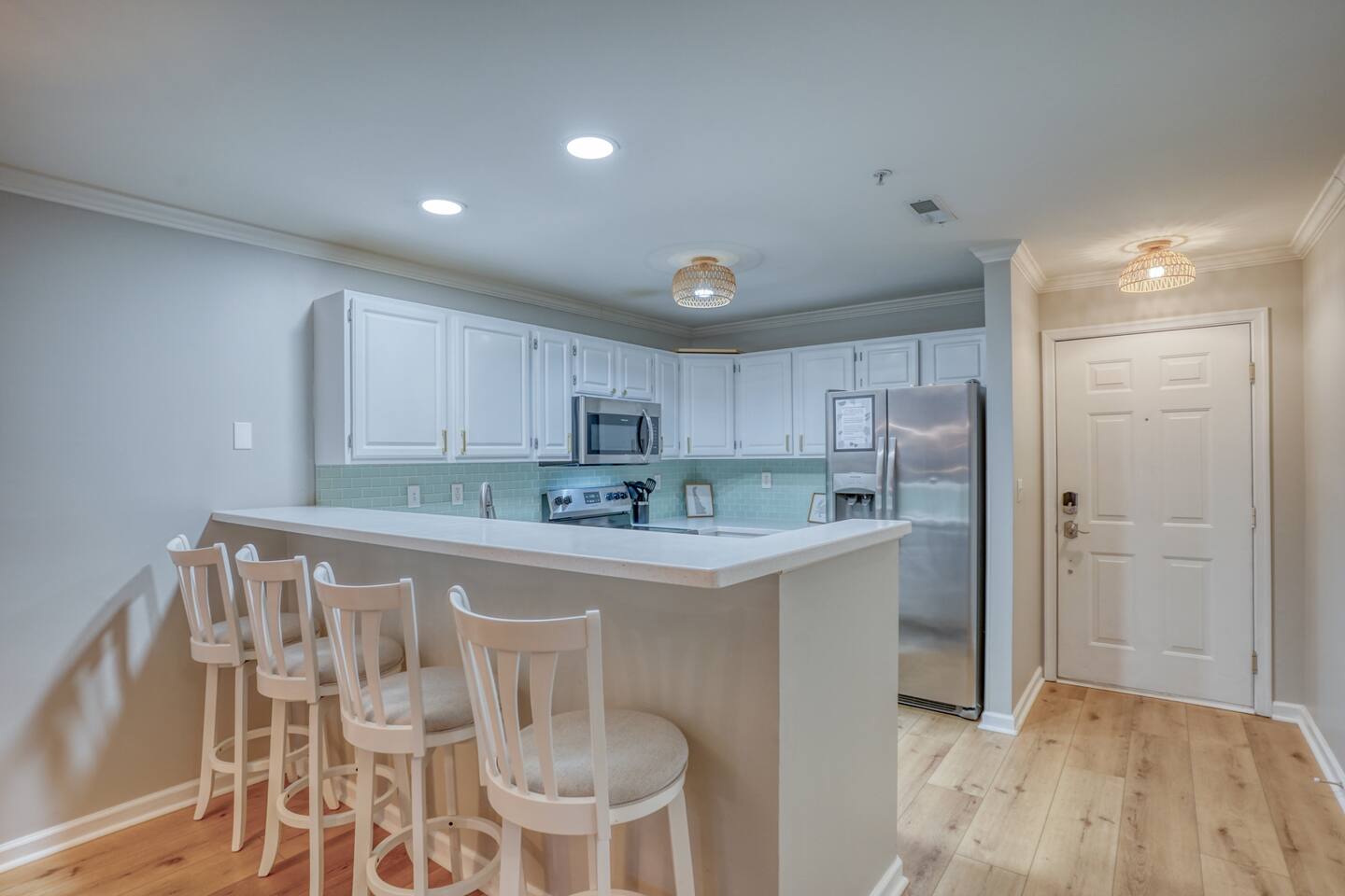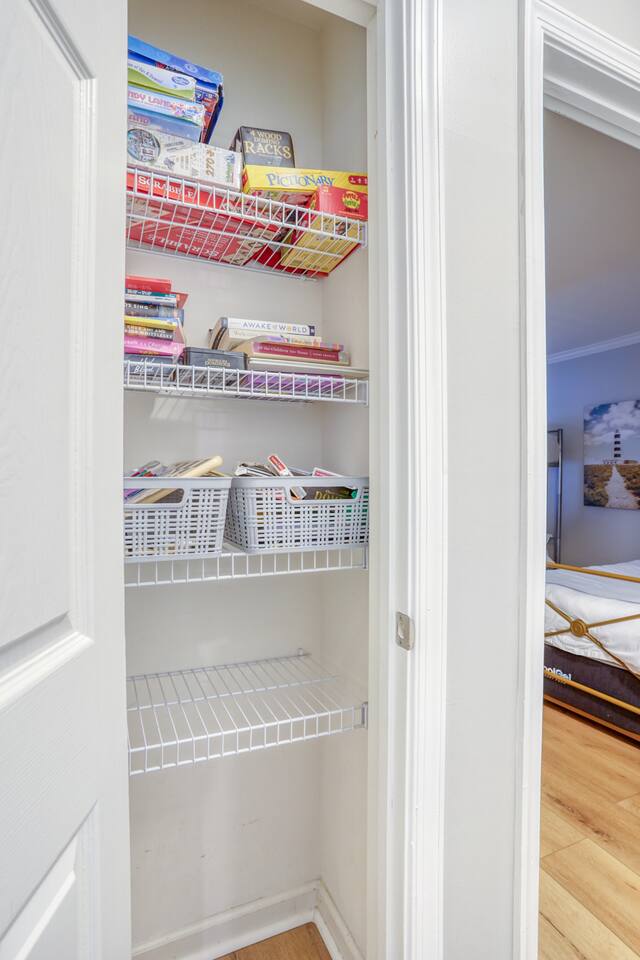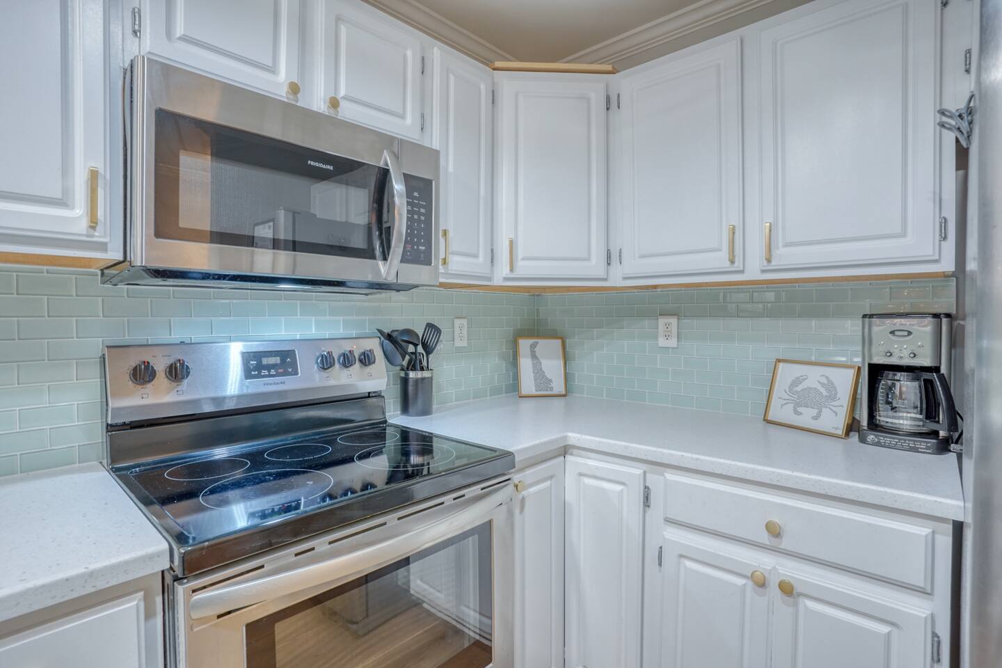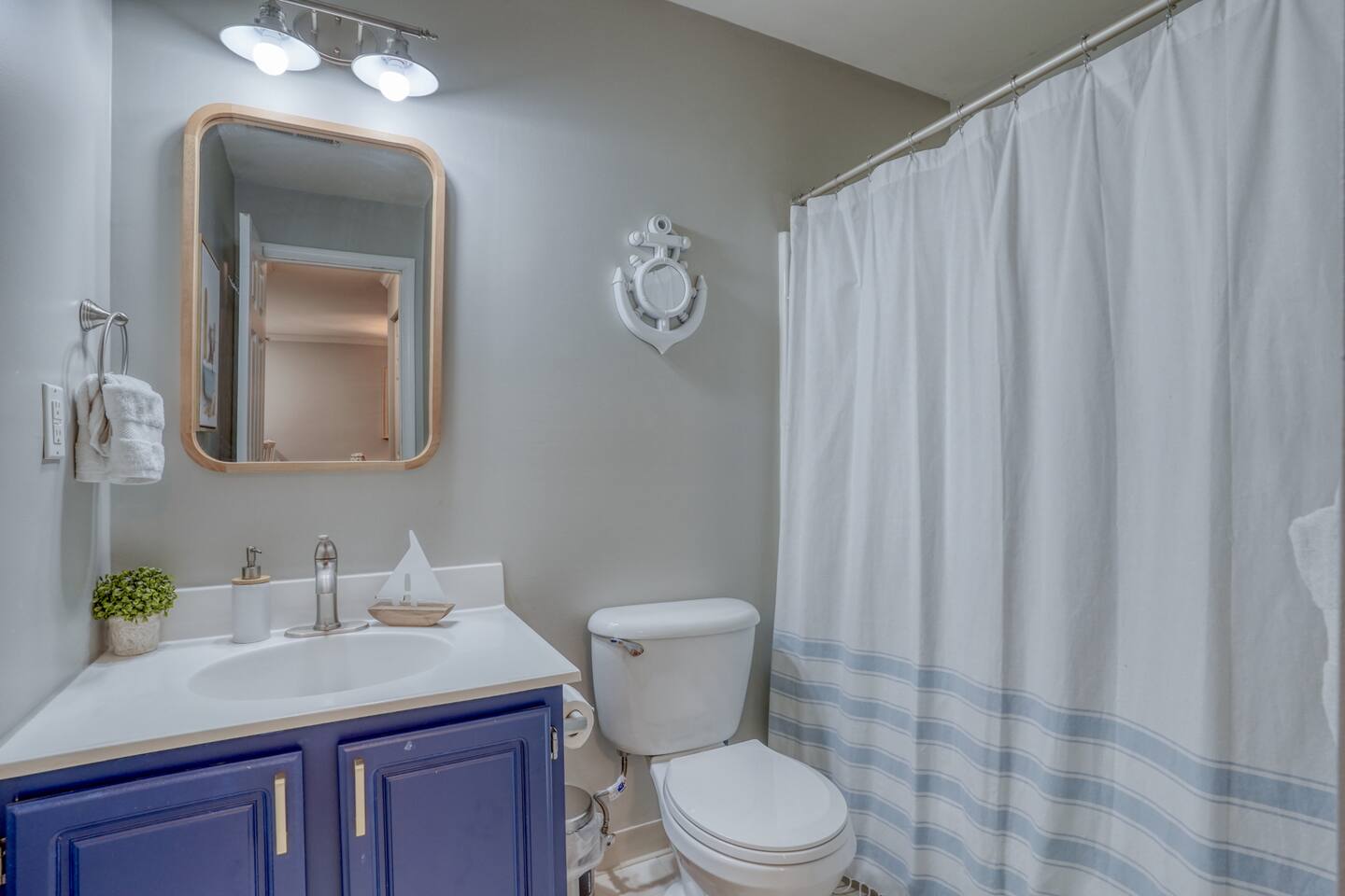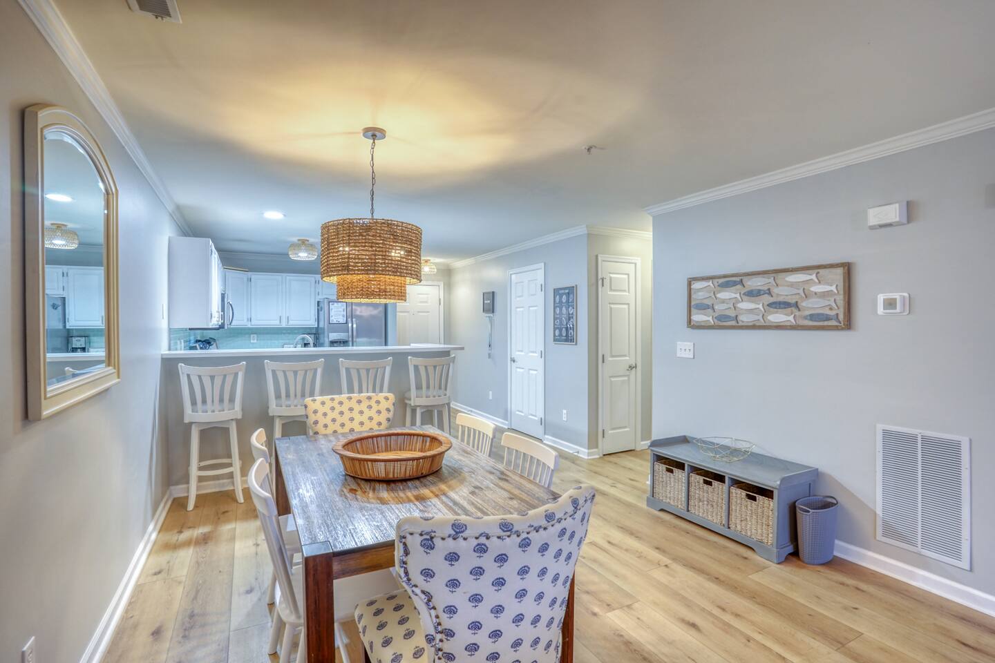 Be aware that the second-floor condo is accessible via stairs. An elevator is available, but it only reaches the third floor, so you will need to walk down one flight of stairs to access the condo. As you enter the front door, you'll find a well-stocked, modern kitchen. To the left is the guest bedroom, which sleeps five guests comfortably with a full-size bed (and single trundle) and a twin bunk bed. Adjacent to the guest bedroom is a full bathroom featuring a bath tub and shower combination. Further into the condo, you'll find the primary bedroom, equipped with a king-size bed, a flat screen smart TV, and an ensuite bathroom with a large vanity and walk-in shower. The living room offers cozy seating and another flat screen smart TV. Just off the living room, step onto the screened-in porch overlooking the community pond and fountain, complete with patio furniture and a hammock swing for your relaxation. Enjoy the peaceful views and unwind in this inviting outdoor space. The condo includes a stackable washer and dryer with complimentary detergent, as well as provided sheets and bath towels for your convenience. Beach chairs, an umbrella, and boogie boards are available for your use as well.