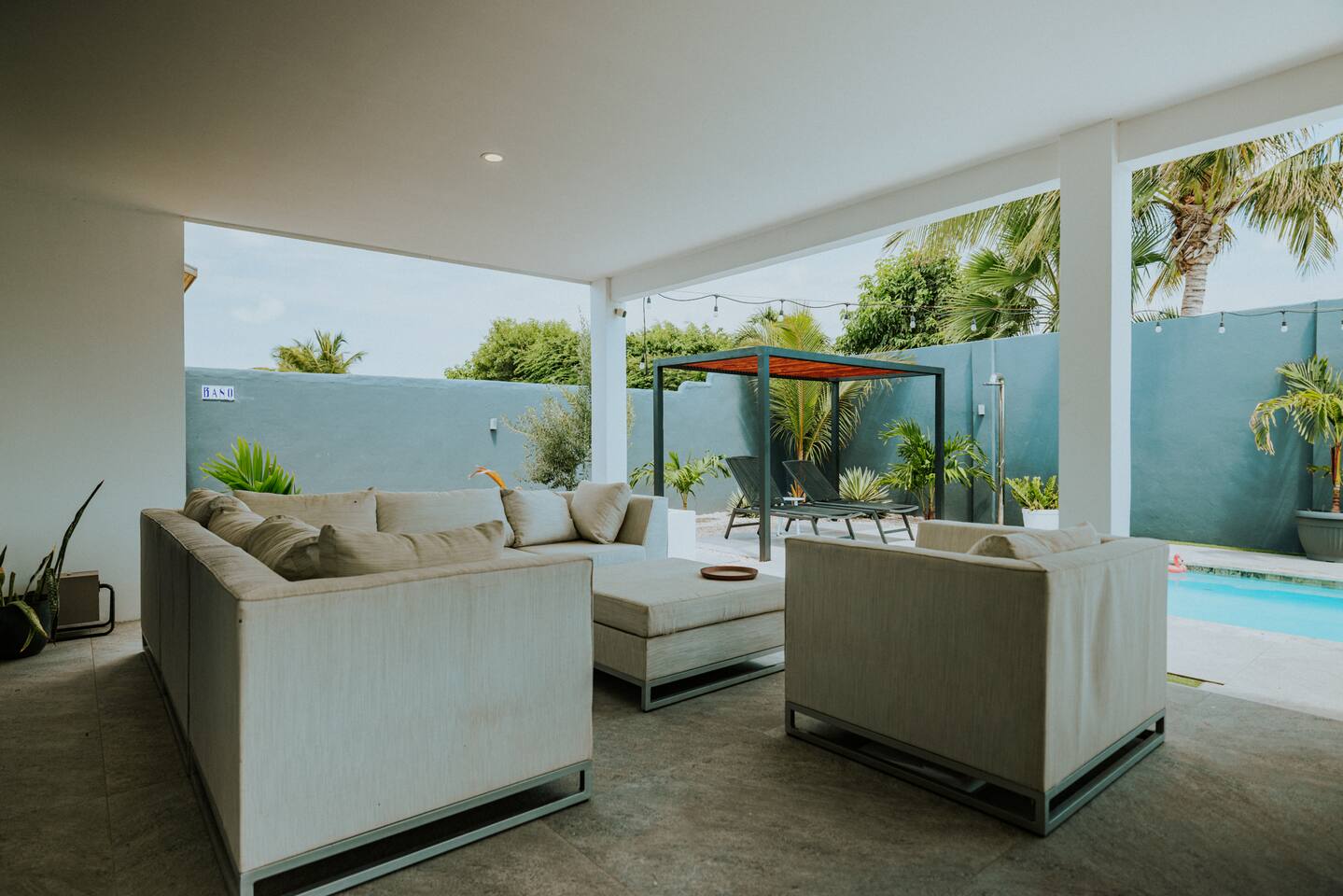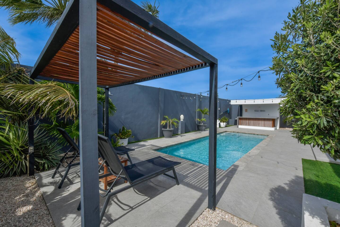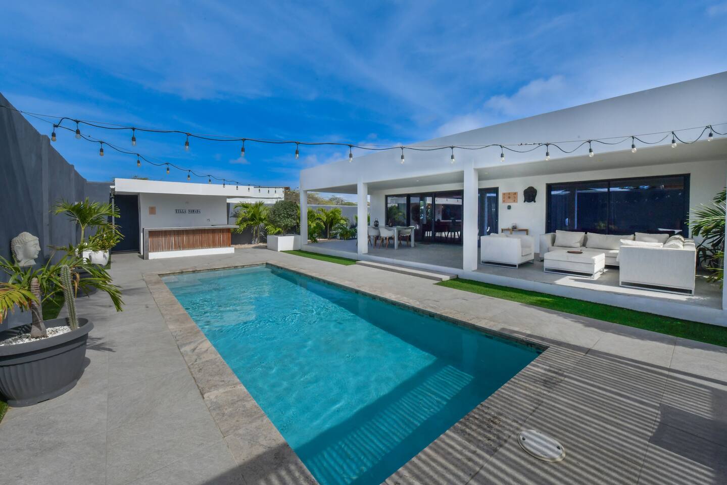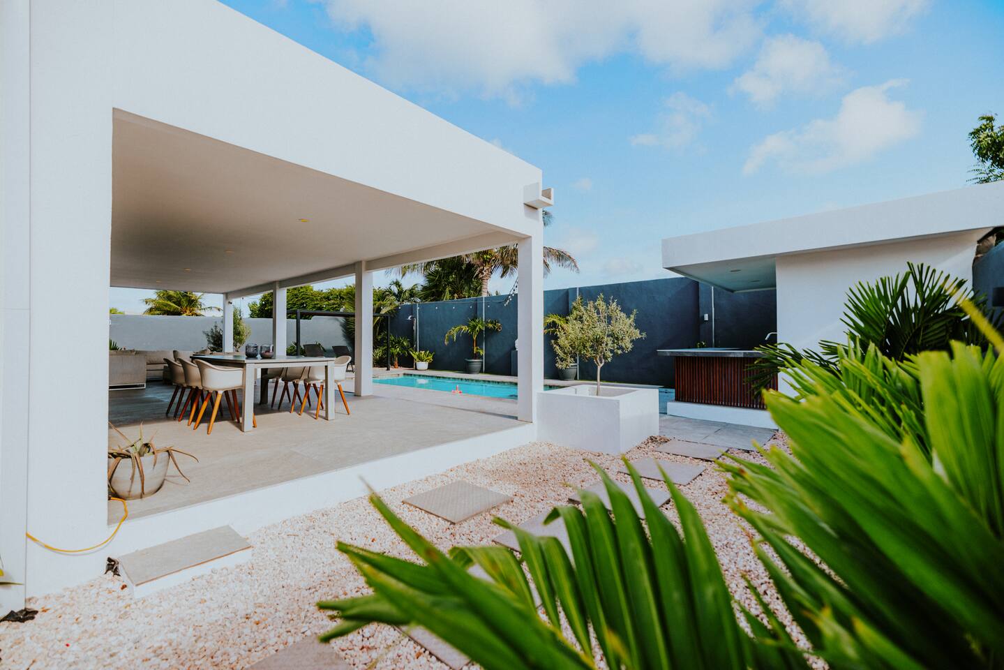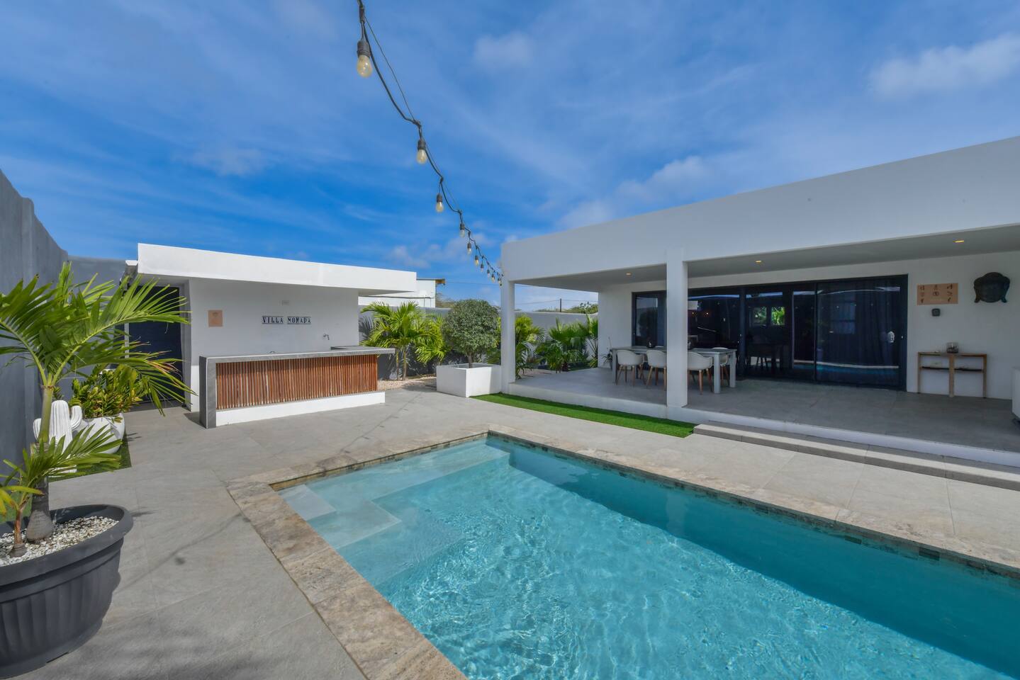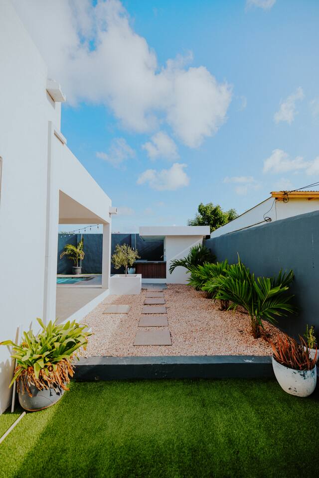 Peace and tranquility await at Villa Nomada, just a 2-minute drive from Eagle Beach and 5 minutes from Oranjestad. Thoughtfully renovated with love and care, this villa combines beach living with island charm, creating a beautifully minimal and serene retreat for much-needed rest and relaxation. Each room is styled with soft neutral tones and natural wooden furnishings, evoking a warm island feel while maintaining a sense of simplicity and calm. Centrally located yet wonderfully private, Villa Nomada allows you to fully embrace the laid-back island lifestyle. Step into the garden and discover your own private oasis. The shaded patio is perfect for wining and dining, while the pool invites you to cool off and recharge. Designed to slow life down, the garden offers everything you need - and nothing you don’t. Unwind with long, lazy meals, sunbathe on the loungers, sip refreshing drinks from the bar, or indulge in an afternoon nap in the island breeze.