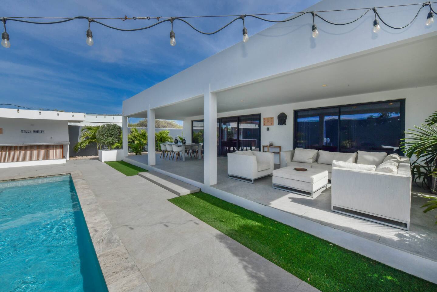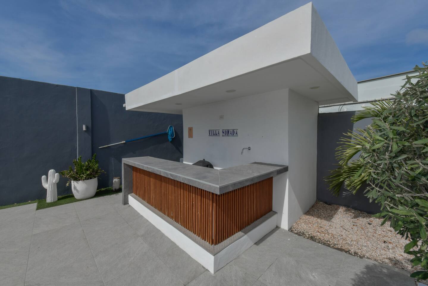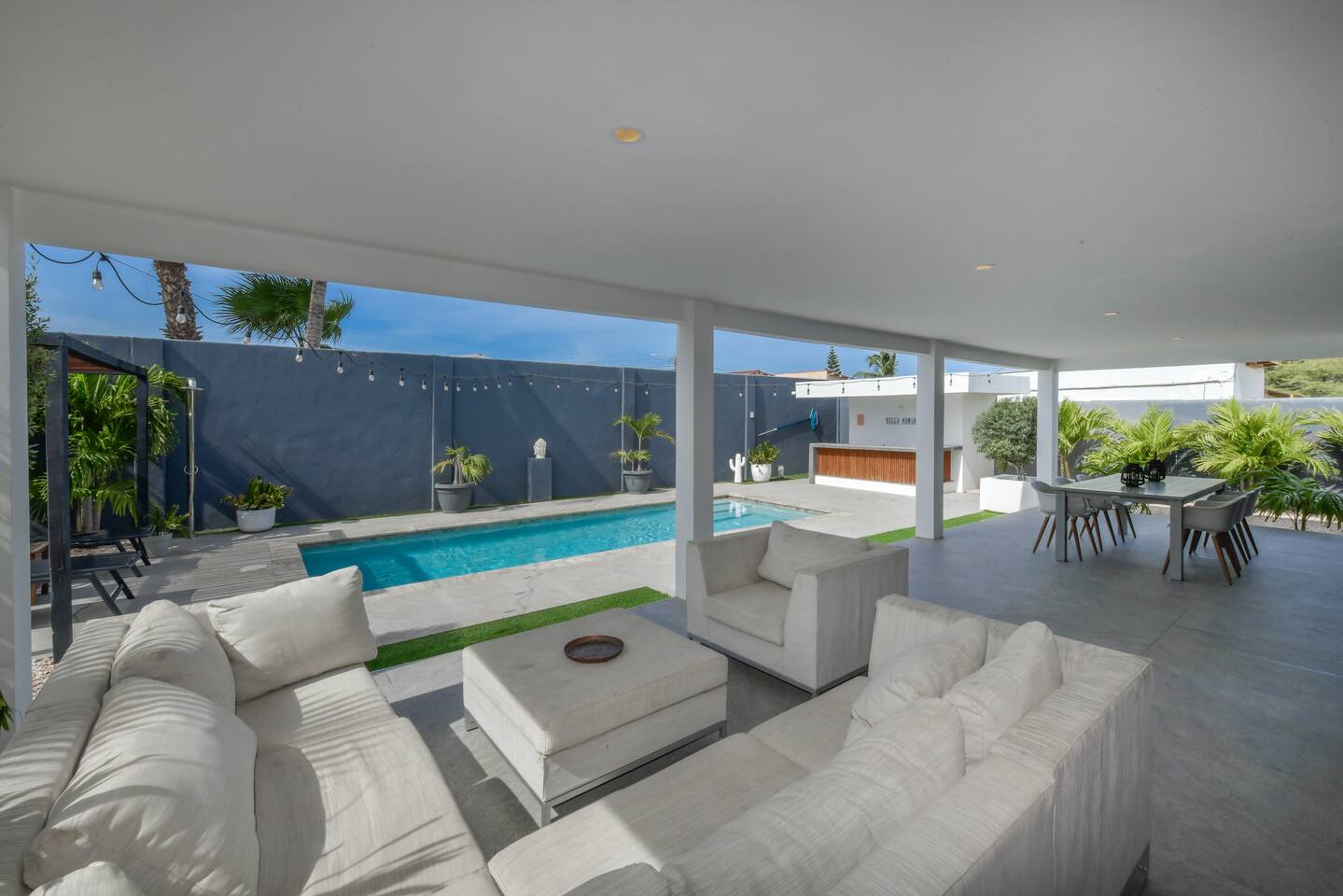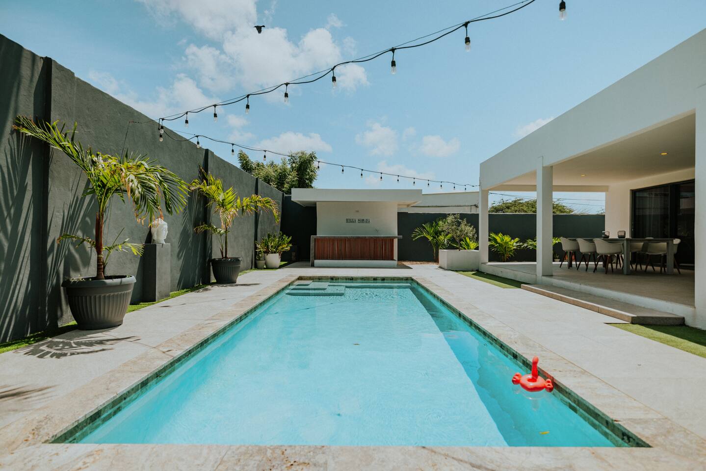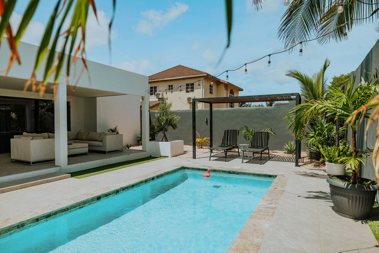 Peace and tranquility await at Villa Nomada, just a 2-minute drive from Eagle Beach and 5 minutes from Oranjestad. Thoughtfully renovated with love and care, this villa combines beach living with island charm, creating a beautifully minimal and serene retreat for much-needed rest and relaxation. Each room is styled with soft neutral tones and natural wooden furnishings, evoking a warm island feel while maintaining a sense of simplicity and calm. Centrally located yet wonderfully private, Villa Nomada allows you to fully embrace the laid-back island lifestyle. Step into the garden and discover your own private oasis. The shaded patio is perfect for wining and dining, while the pool invites you to cool off and recharge. Designed to slow life down, the garden offers everything you need - and nothing you don’t. Unwind with long, lazy meals, sunbathe on the loungers, sip refreshing drinks from the bar, or indulge in an afternoon nap in the island breeze.