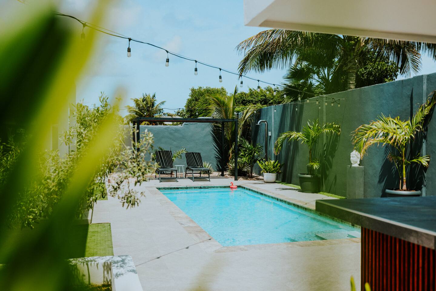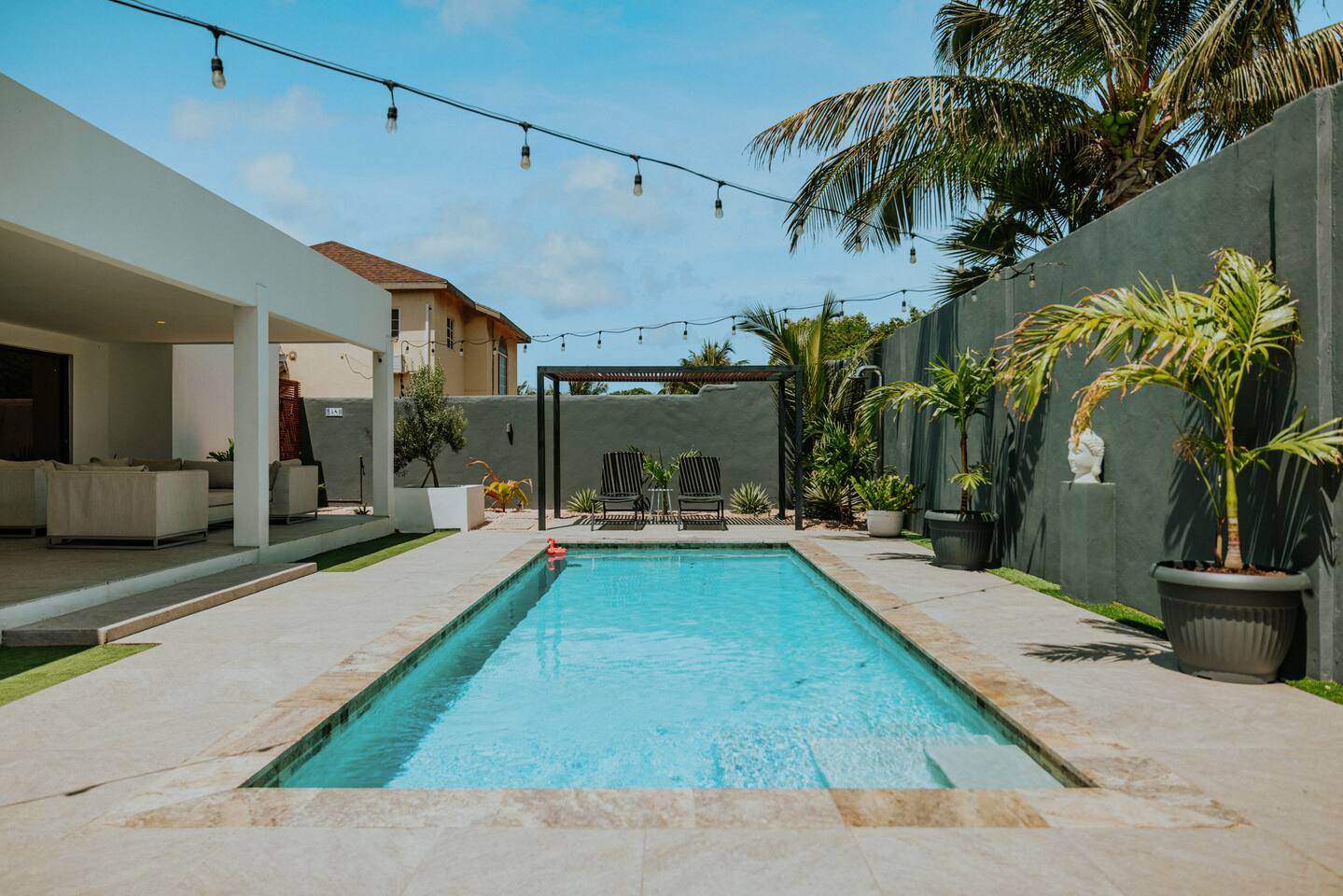 This fully private villa is perfectly located near beautiful beaches, restaurants, and supermarkets. You can truly relax and unwind while creating memories that will last a lifetime. Our vision was to create a serene and cozy space where you can fully embrace the laid-back island lifestyle. Start your mornings with breakfast on the patio, enjoy leisurely lunches or dinners, and end the day with drinks shared with friends or family all while forgetting about the clock and soaking in the moment.